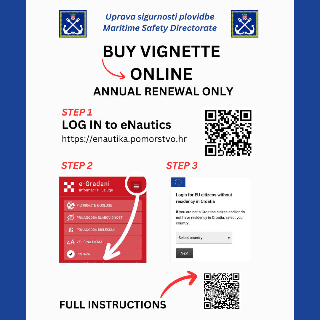 Prilikom uplovljavanja u unutarnje morske vode i teritorijalno more Republike Hrvatske zapovjednik plovila je dužan uploviti najkraćim putem u najbližu luku otvorenu za međunarodni promet radi obavljanja granične kontrole te ishoditi vinjetu u lučkoj kapetaniji ili ispostavi.